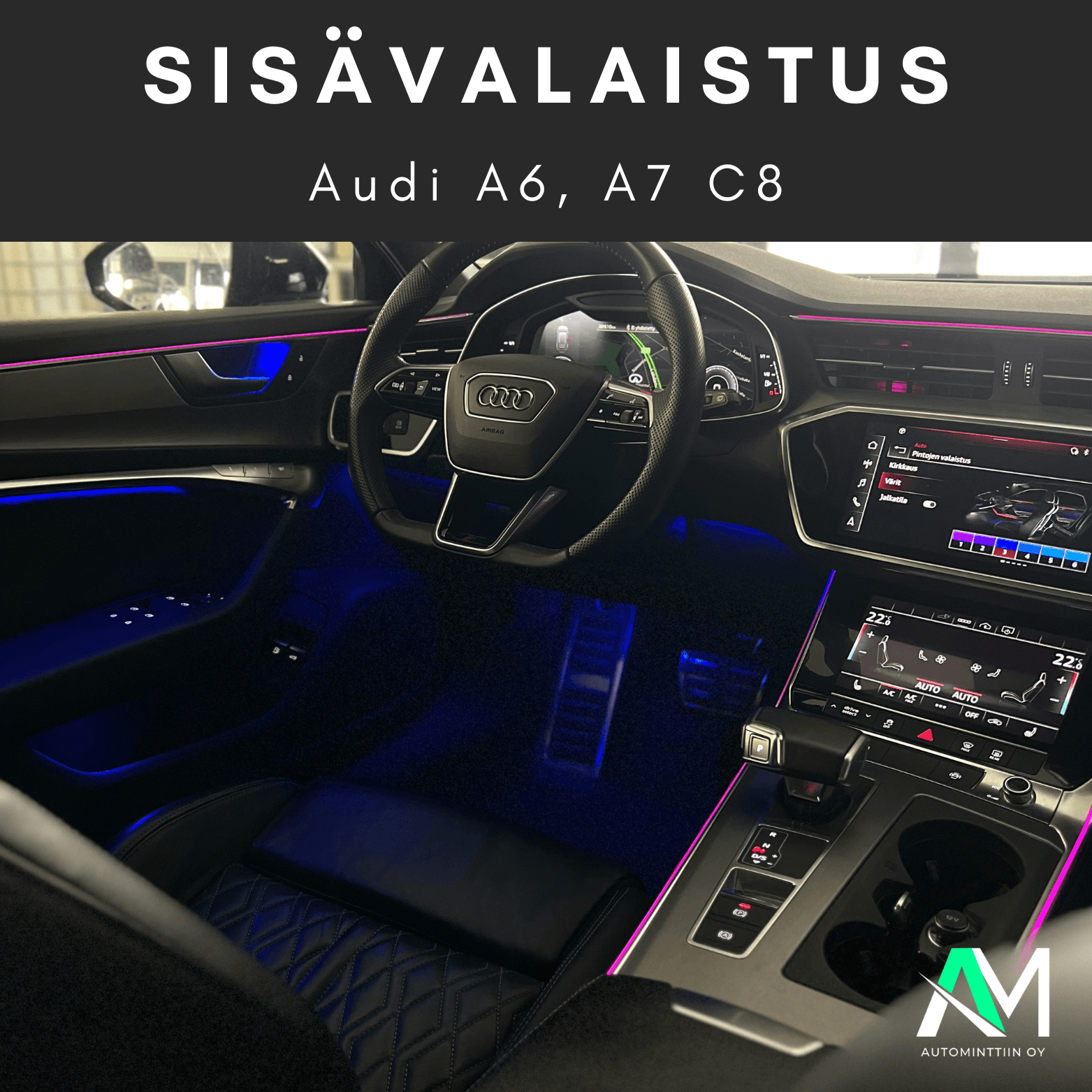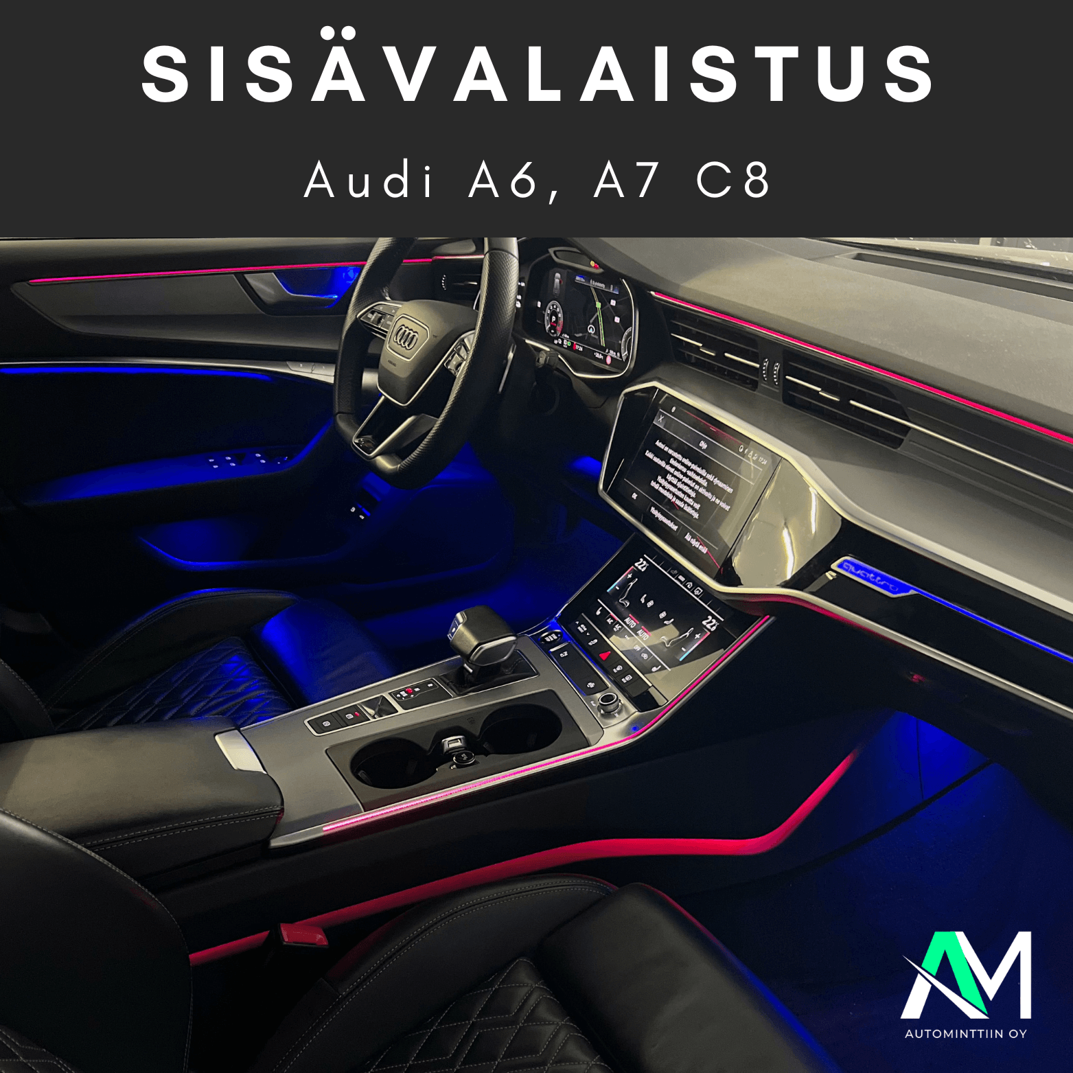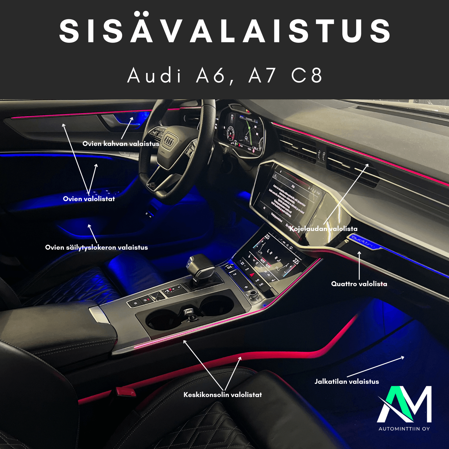 Tämä on meidän paras ratkaisu Audi A6, A7 C8 korimalleihin, se tuo valaistusta sisustan jokaiseen alueeseen ja pimeän aikaan luo mukavan tunnelman jokaiselle matkustajalle, kuin myös kuljettajalle.