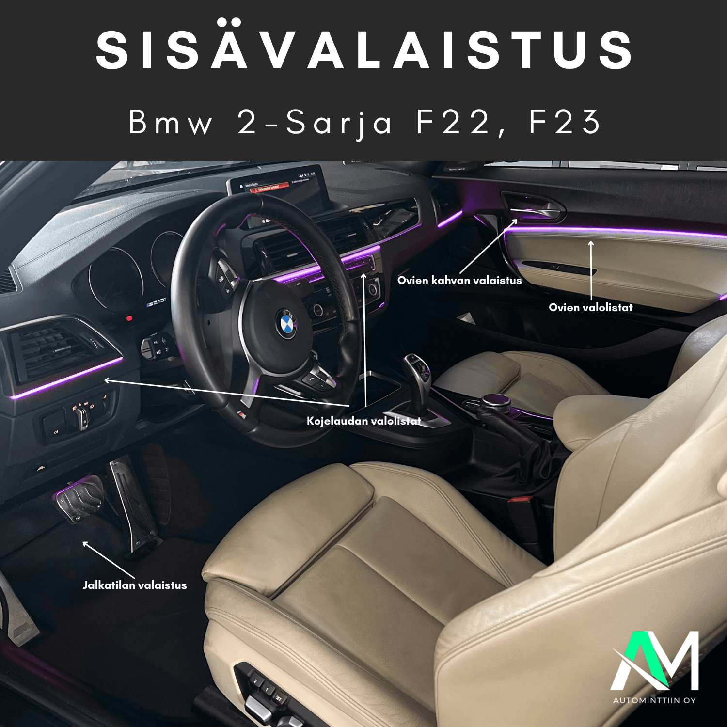 Tämä on meidän paras ratkaisu Bmw F22 ja F23 korimalleihin, se tuo valaistusta sisustan jokaiseen alueeseen ja pimeän aikaan luo mukavan tunnelman jokaiselle matkustajalle, kuin myös kuljettajalle.